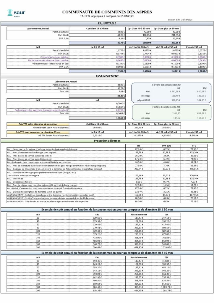 La communauté de communes des Aspres communique la fiche tarifaire applicable en 2026 pour les consommations d’eau potable, l’assainissement des eaux usées ainsi que les prestations associées.